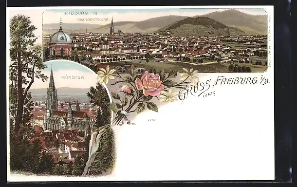 Lithographie Freiburg i. B., Münster, Totalansicht vom Lorettoberg
