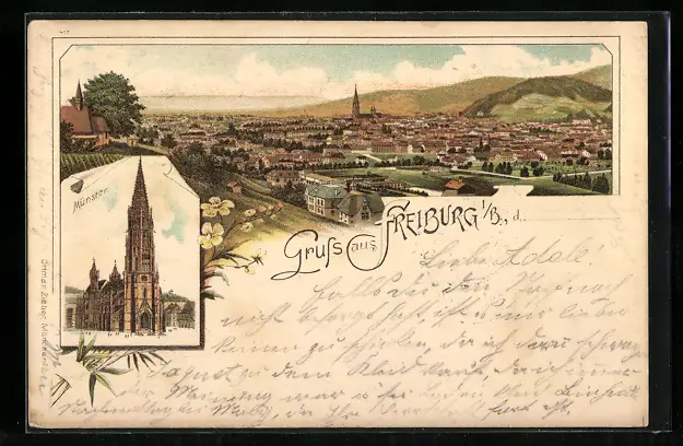 Lithographie Freiburg i. B., Ortsansicht und Blick auf Münster