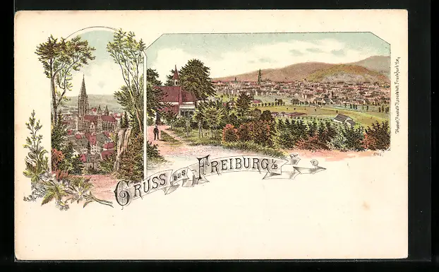 Lithographie Freiburg i. B., Panorama mit Kirche
