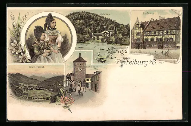 Lithographie Freiburg i. B., Rathaus, Waldsee, Güntersthal
