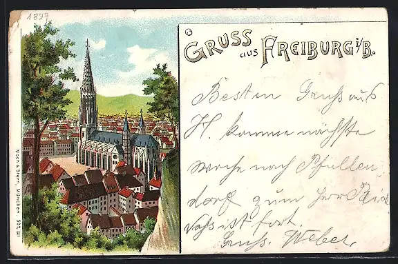 Lithographie Freiburg i. B., Teilansicht mit Kirche aus der Vogelschau