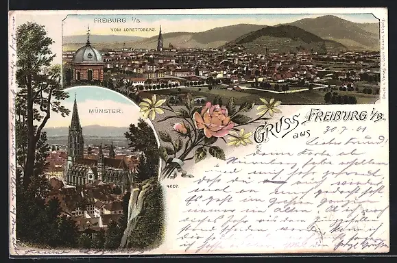Lithographie Freiburg i. B., Teilansicht vom Lorettoberg, Münster