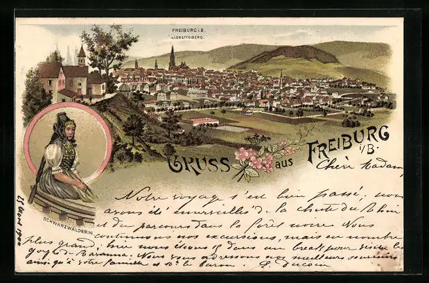 Lithographie Freiburg i. B., Totalansicht mit Dame in Tracht