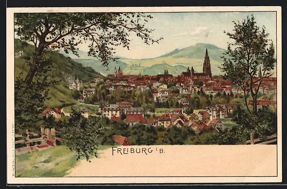 Lithographie Freiburg i. B., Totalansicht mit Kirche, Häuser und Landschaft