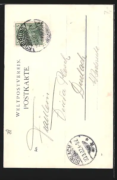 Personenbezogene Daten auf der Rückseite der Karte wurden durch blauen Textmarker unkenntlich gemacht. Die blauen Stellen sind auf die Vorderseite durchgeweicht und wirken sich negativ auf das Postkartenfoto aus