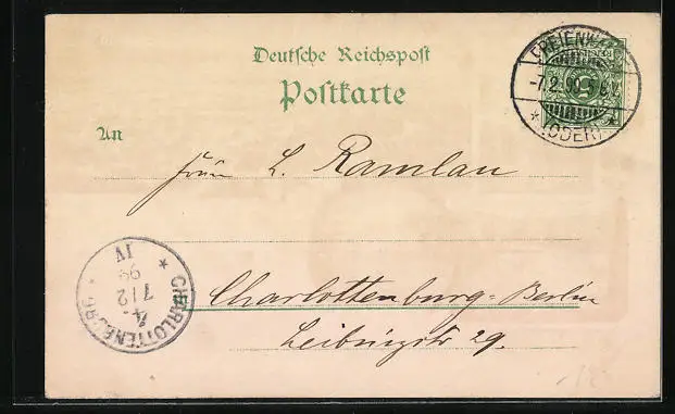 Personenbezogene Daten auf der Rückseite der Karte wurden durch blauen Textmarker unkenntlich gemacht. Die blauen Stellen sind auf die Vorderseite durchgeweicht und wirken sich negativ auf das Postkartenfoto aus