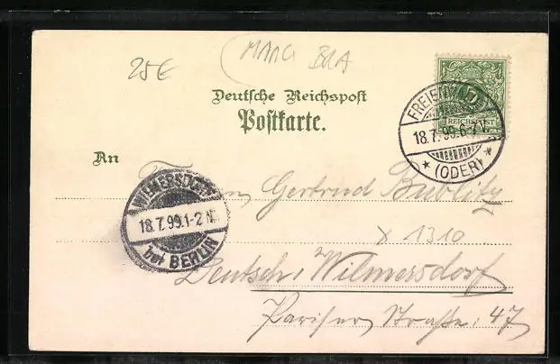 Personenbezogene Daten auf der Rückseite der Karte wurden durch blauen Textmarker unkenntlich gemacht. Die blauen Stellen sind auf die Vorderseite durchgeweicht und wirken sich negativ auf das Postkartenfoto aus