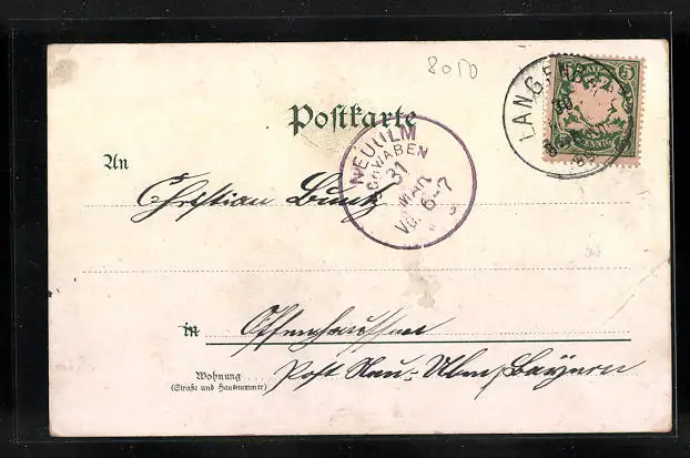 Personenbezogene Daten auf der Rückseite der Karte wurden durch blauen Textmarker unkenntlich gemacht. Die blauen Stellen sind auf die Vorderseite durchgeweicht und wirken sich negativ auf das Postkartenfoto aus
