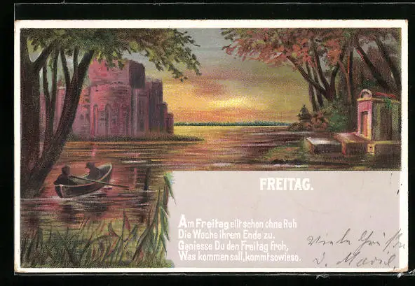 Lithographie Freitag, Ruderpartie im Abendrot