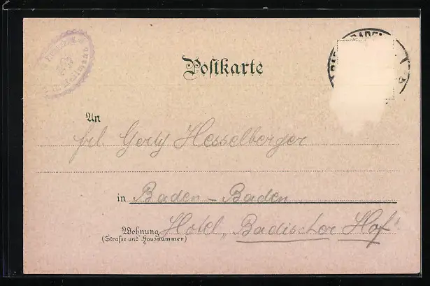 Personenbezogene Daten auf der Rückseite der Karte wurden durch blauen Textmarker unkenntlich gemacht. Die blauen Stellen sind auf die Vorderseite durchgeweicht und wirken sich negativ auf das Postkartenfoto aus