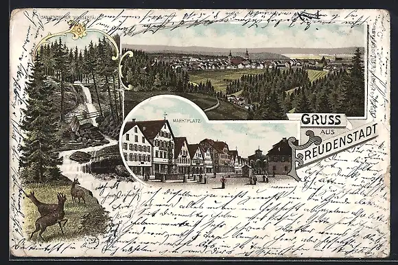 Lithographie Freudenstadt, Marktplatz, Wasserfall mit Rehen, Ortsansicht