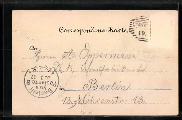 gelaufen 1897, Bugspur oben li., Briefmarke entfernt, rückseitig Oberflächenschaden, guter Zustand