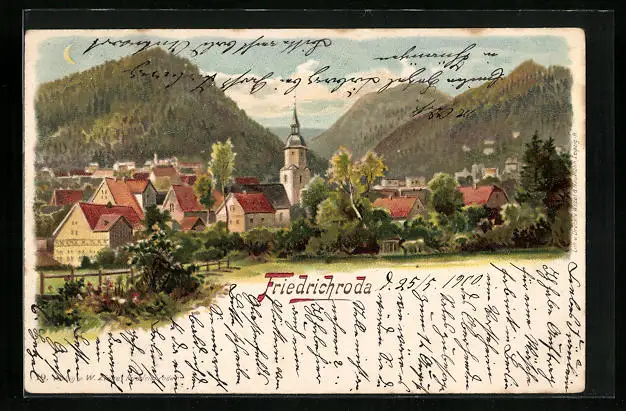 Lithographie Friedrichroda, Ortsansicht mit Kirche