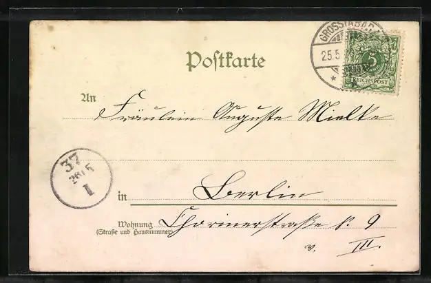 Personenbezogene Daten auf der Rückseite der Karte wurden durch blauen Textmarker unkenntlich gemacht. Die blauen Stellen sind auf die Vorderseite durchgeweicht und wirken sich negativ auf das Postkartenfoto aus