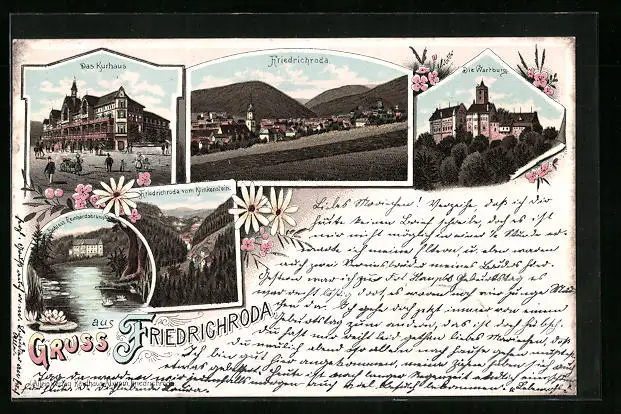Lithographie Friedrichroda, Schloss Reinhardsbrunn, Kurhaus, Totalansicht