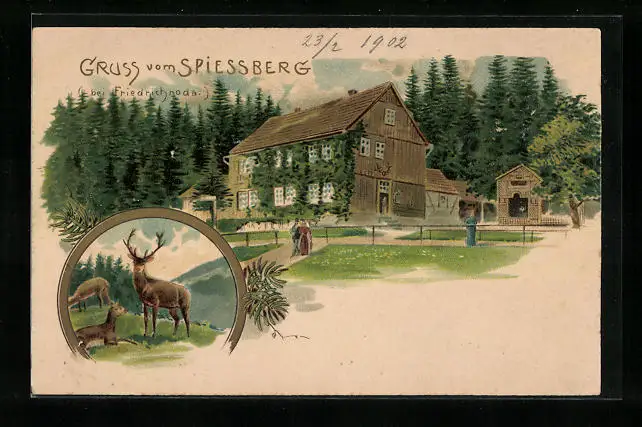 Lithographie Friedrichroda, Spiessberg, Hirsch und Rehe