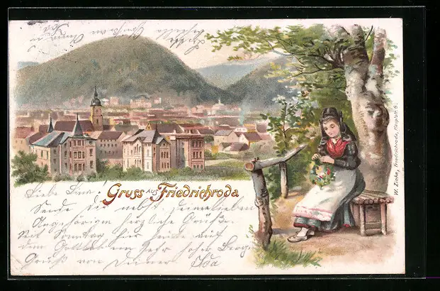 Lithographie Friedrichroda, Totalansicht mit Gebirge