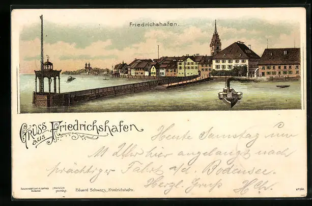 Lithographie Friedrichshafen, Ortsansicht mit Hafenpartie