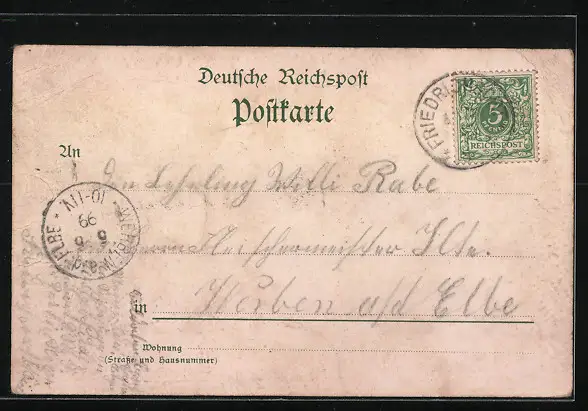Personenbezogene Daten auf der Rückseite der Karte wurden durch blauen Textmarker unkenntlich gemacht. Die blauen Stellen sind auf die Vorderseite durchgeweicht und wirken sich negativ auf das Postkartenfoto aus