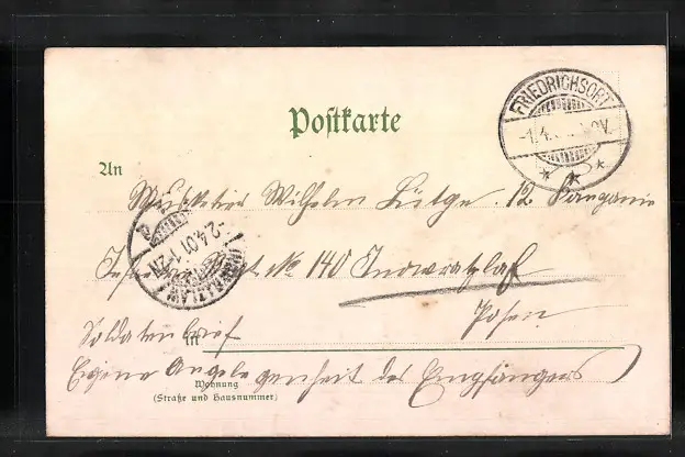 Personenbezogene Daten auf der Rückseite der Karte wurden durch blauen Textmarker unkenntlich gemacht. Die blauen Stellen sind auf die Vorderseite durchgeweicht und wirken sich negativ auf das Postkartenfoto aus