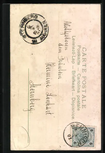 Personenbezogene Daten auf der Rückseite der Karte wurden durch blauen Textmarker unkenntlich gemacht. Die blauen Stellen sind auf die Vorderseite durchgeweicht und wirken sich negativ auf das Postkartenfoto aus