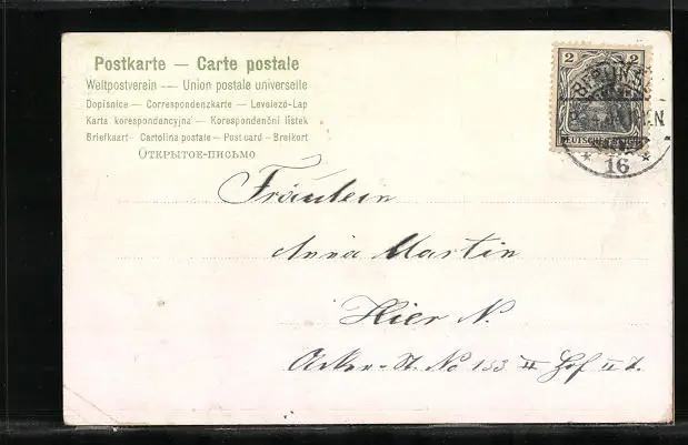 Personenbezogene Daten auf der Rückseite der Karte wurden durch blauen Textmarker unkenntlich gemacht. Die blauen Stellen sind auf die Vorderseite durchgeweicht und wirken sich negativ auf das Postkartenfoto aus