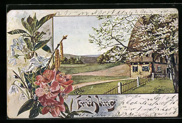 Lithographie Frühling, Blumen, Weidenkätzchen