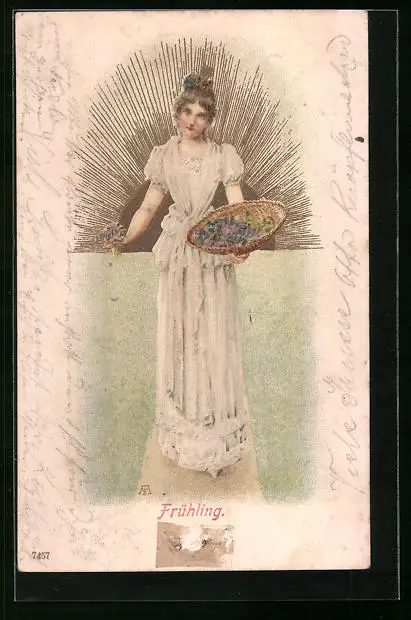 Lithographie Frühling, Fräulein mit Blumenkorb im Jugendstil