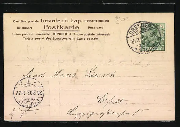 Personenbezogene Daten auf der Rückseite der Karte wurden durch blauen Textmarker unkenntlich gemacht. Die blauen Stellen sind auf die Vorderseite durchgeweicht und wirken sich negativ auf das Postkartenfoto aus