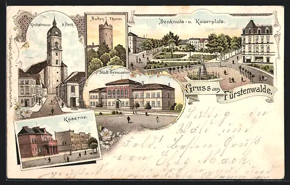 Lithographie Fürstenwalde / Spree, Denkmals- u. Kaiserplatz, Bullenturm, Kirchstrasse, Dom, Kaserne, Gymnasium