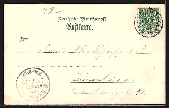 Personenbezogene Daten auf der Rückseite der Karte wurden durch blauen Textmarker unkenntlich gemacht. Die blauen Stellen sind auf die Vorderseite durchgeweicht und wirken sich negativ auf das Postkartenfoto aus