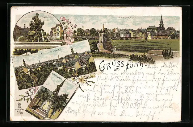 Lithographie Fürth, Kunstbrunnen, Kriegerdenkmal, Panorama