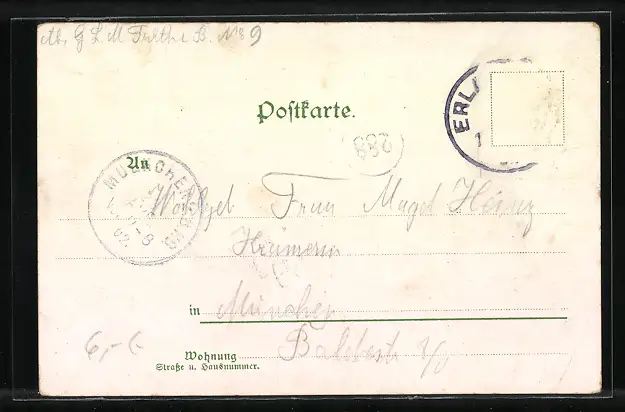 Personenbezogene Daten auf der Rückseite der Karte wurden durch blauen Textmarker unkenntlich gemacht. Die blauen Stellen sind auf die Vorderseite durchgeweicht und wirken sich negativ auf das Postkartenfoto aus