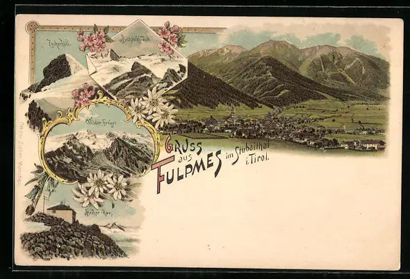 Lithographie Fulpmes, Totalansicht mit Becher-Haus
