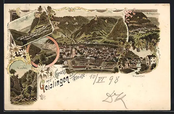 Lithographie Geislingen, Eybach, Felsenthal, Wasserfall