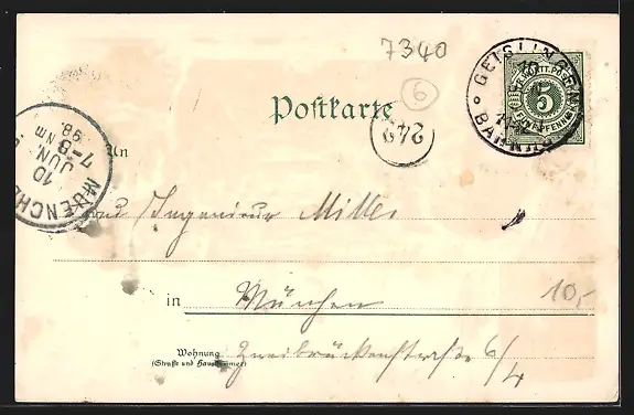Personenbezogene Daten auf der Rückseite der Karte wurden durch blauen Textmarker unkenntlich gemacht. Die blauen Stellen sind auf die Vorderseite durchgeweicht und wirken sich negativ auf das Postkartenfoto aus