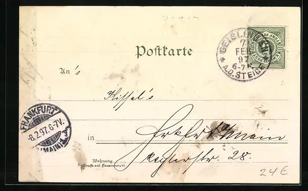 Personenbezogene Daten auf der Rückseite der Karte wurden durch blauen Textmarker unkenntlich gemacht. Die blauen Stellen sind auf die Vorderseite durchgeweicht und wirken sich negativ auf das Postkartenfoto aus