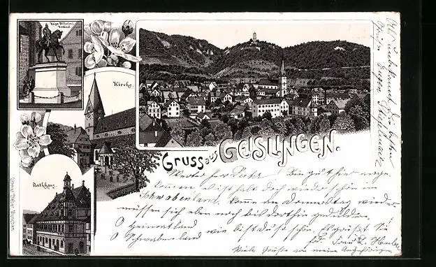 Lithographie Geislingen, Rathaus, Kirche, Kaiser Wilhelm I. Denkmal