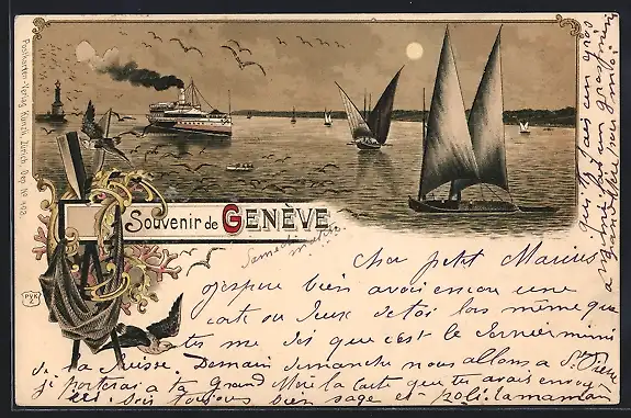 Lithographie Genève, Dampfer und Segelboote auf dem Genfer See