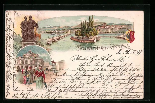 Lithographie Genève, Uferpartie, Denkmal