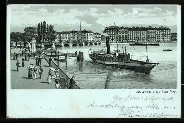 Lithographie Genève, Uferpartie mit Dampfboot