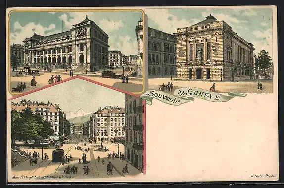 Lithographie Geneve, Victoria Hall, Strassenpartie im Zentrum