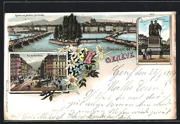 Lithographie Genève, Vue générale Rive Gauche, Rue du Mont Blanc, Monument national