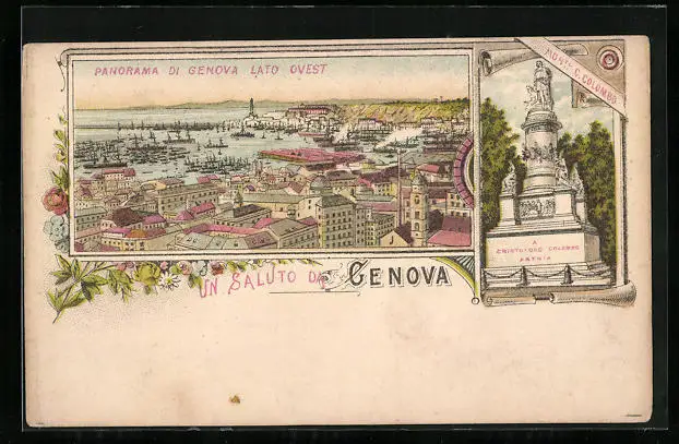Lithographie Genova, Panorama, Monumento C. Colombo