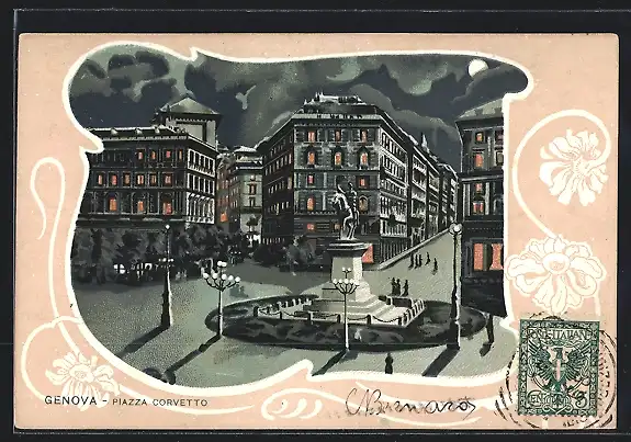 Lithographie Genova, Piazza Corvetto, notturno
