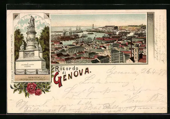 Lithographie Genova, Totalansicht, Monumento a Colombo