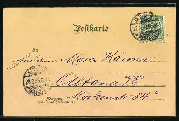 Personenbezogene Daten auf der Rückseite der Karte wurden durch blauen Textmarker unkenntlich gemacht. Die blauen Stellen sind auf die Vorderseite durchgeweicht und wirken sich negativ auf das Postkartenfoto aus