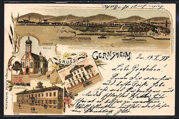 Lithographie Gernsheim, Stadthaus, Kirche, Schule und Schöffer-Denkmal