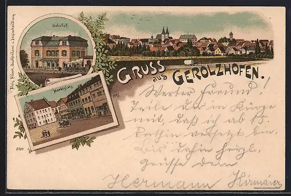 Lithographie Gerolzhofen, Bahnhof, Marktplatz, Totalansicht