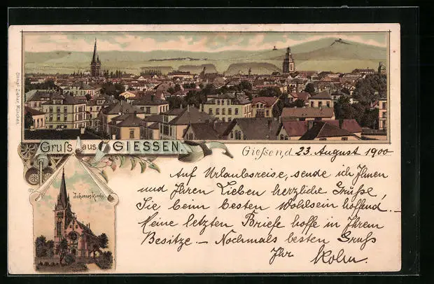 Lithographie Giessen, Ortsansicht mit Johannes-Kirche